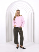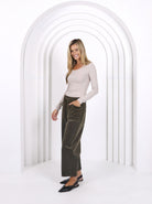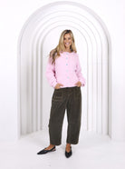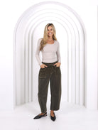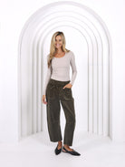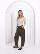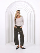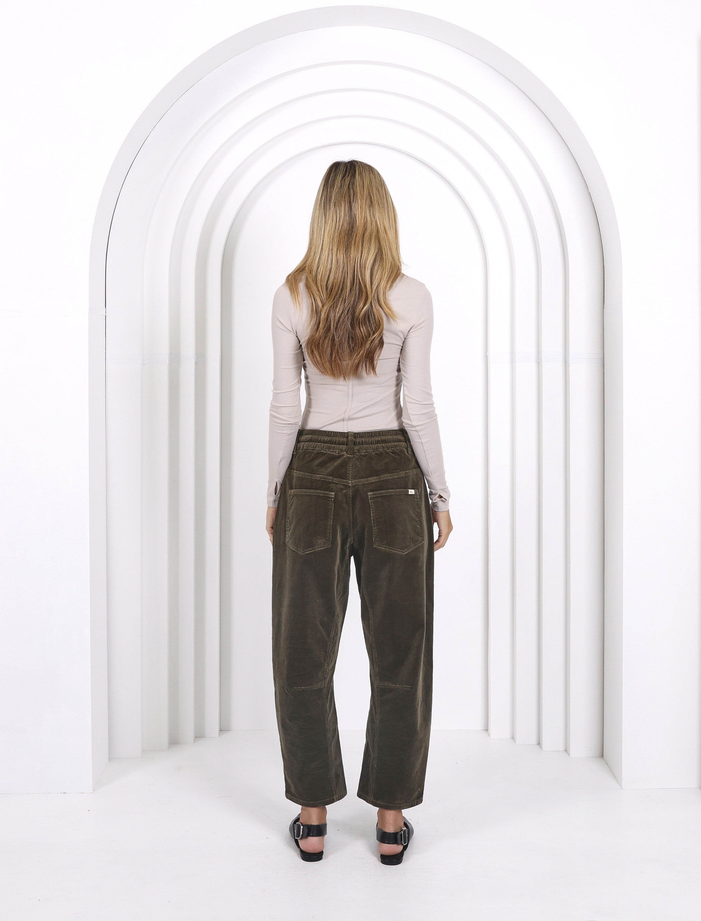These corduroy barrel jeans combine comfort and style effortlessly. With a soft feel, elastic waistband, and adjustable drawstring, they’re made to move with you. Front flap pockets and back pockets add a functional touch, while the relaxed barrel shape fits and flatters every body. Comfortable, versatile, and perfectly on trend.
