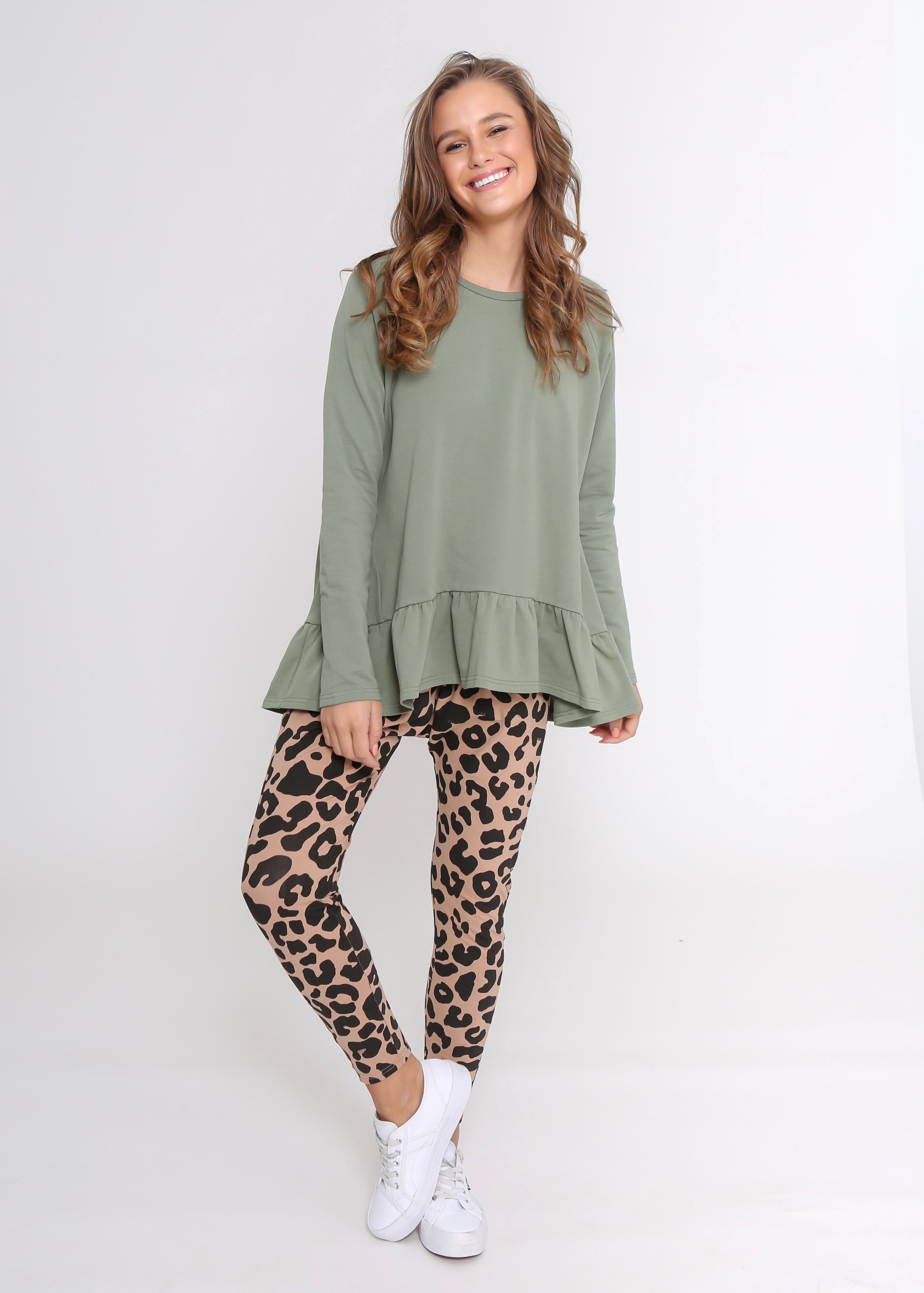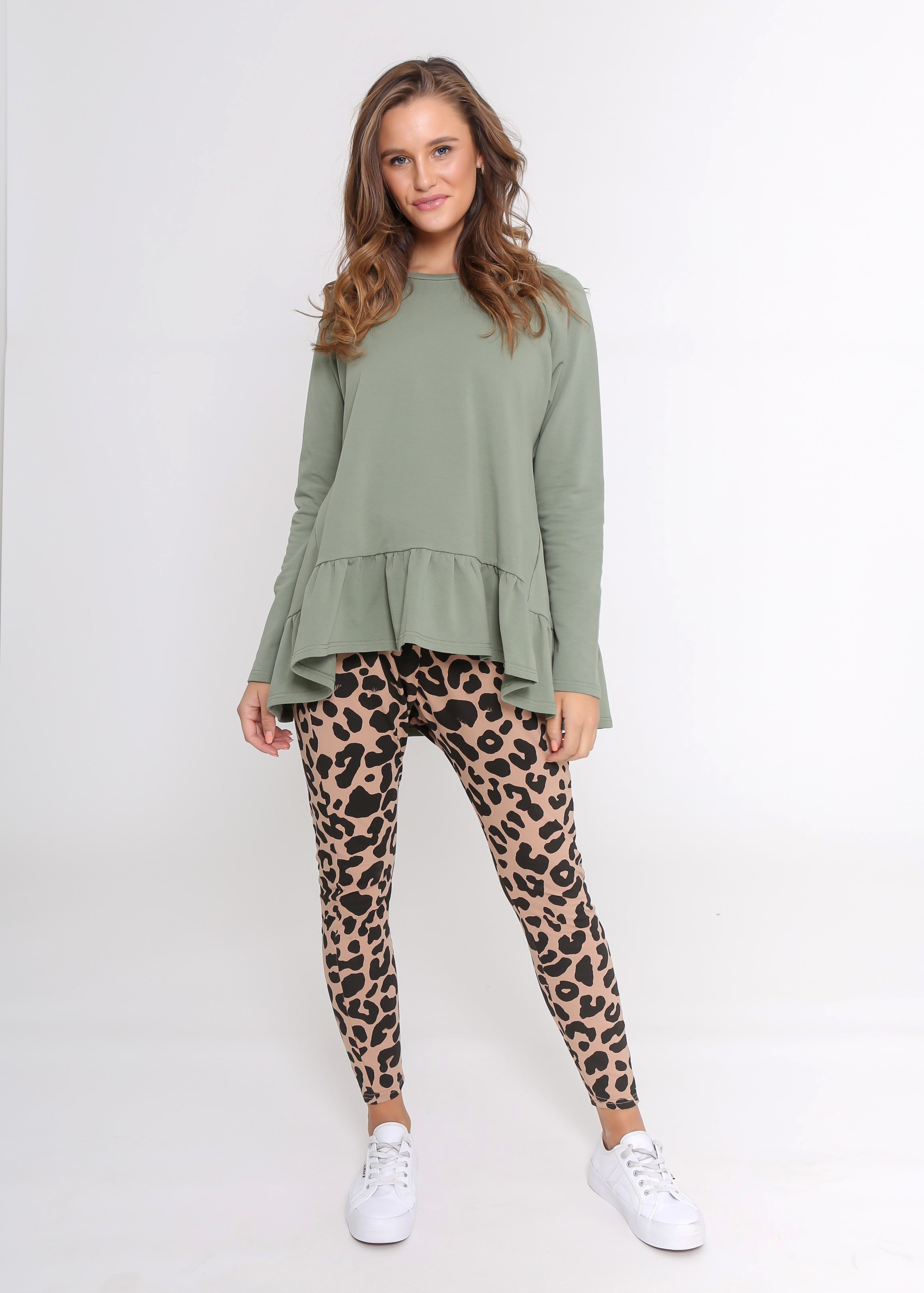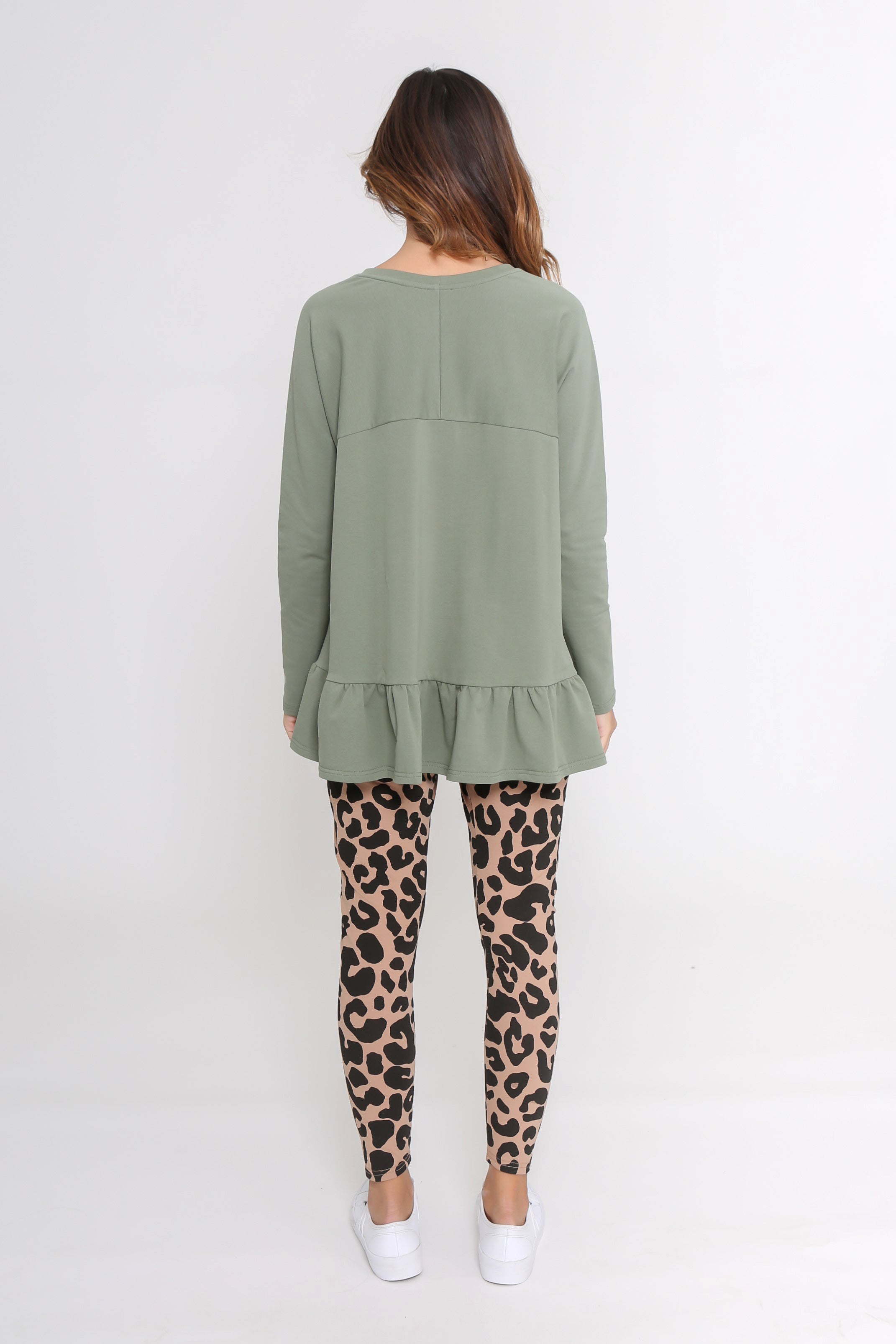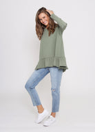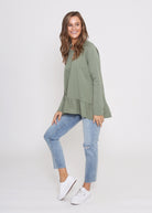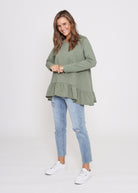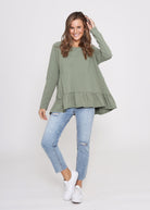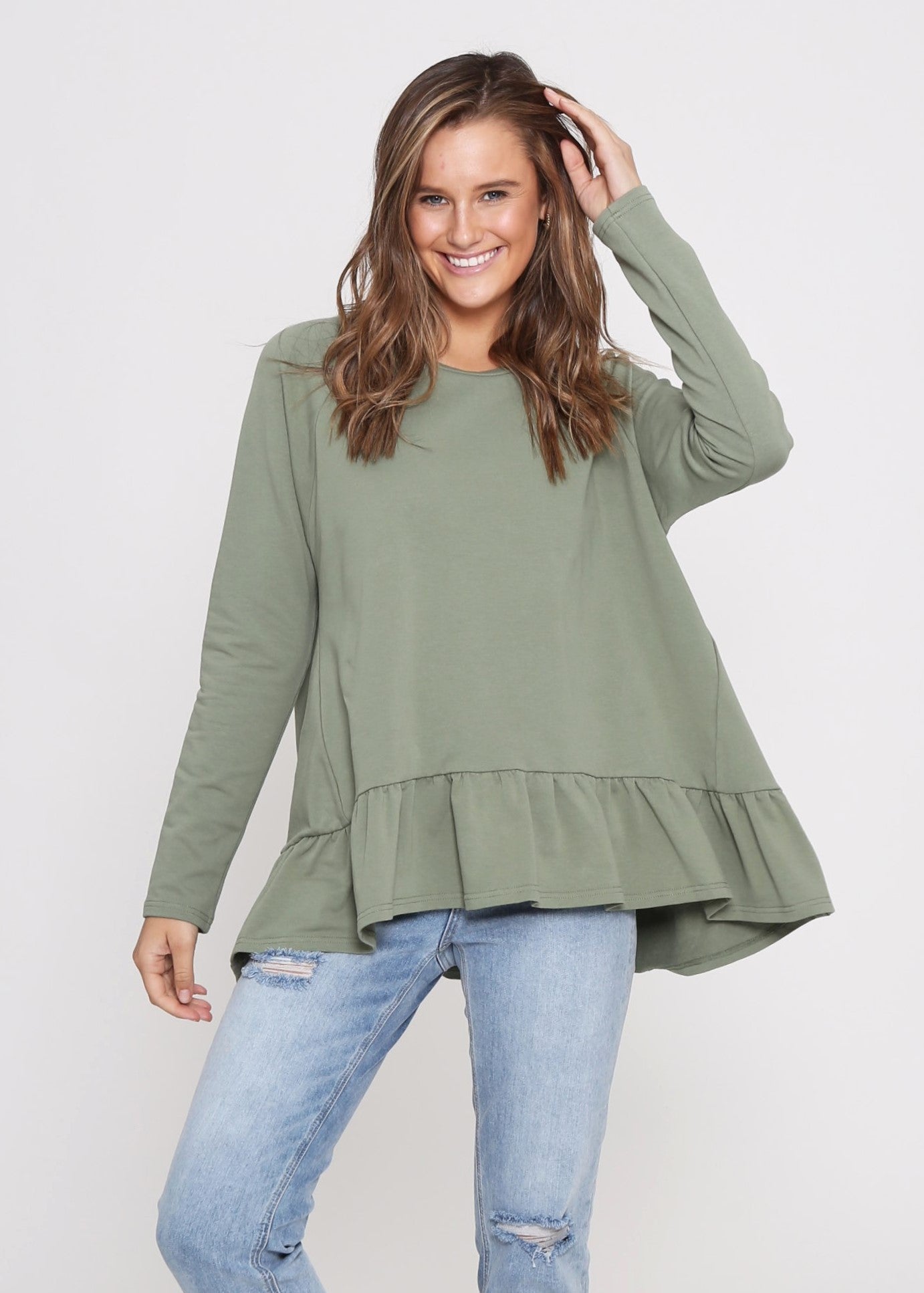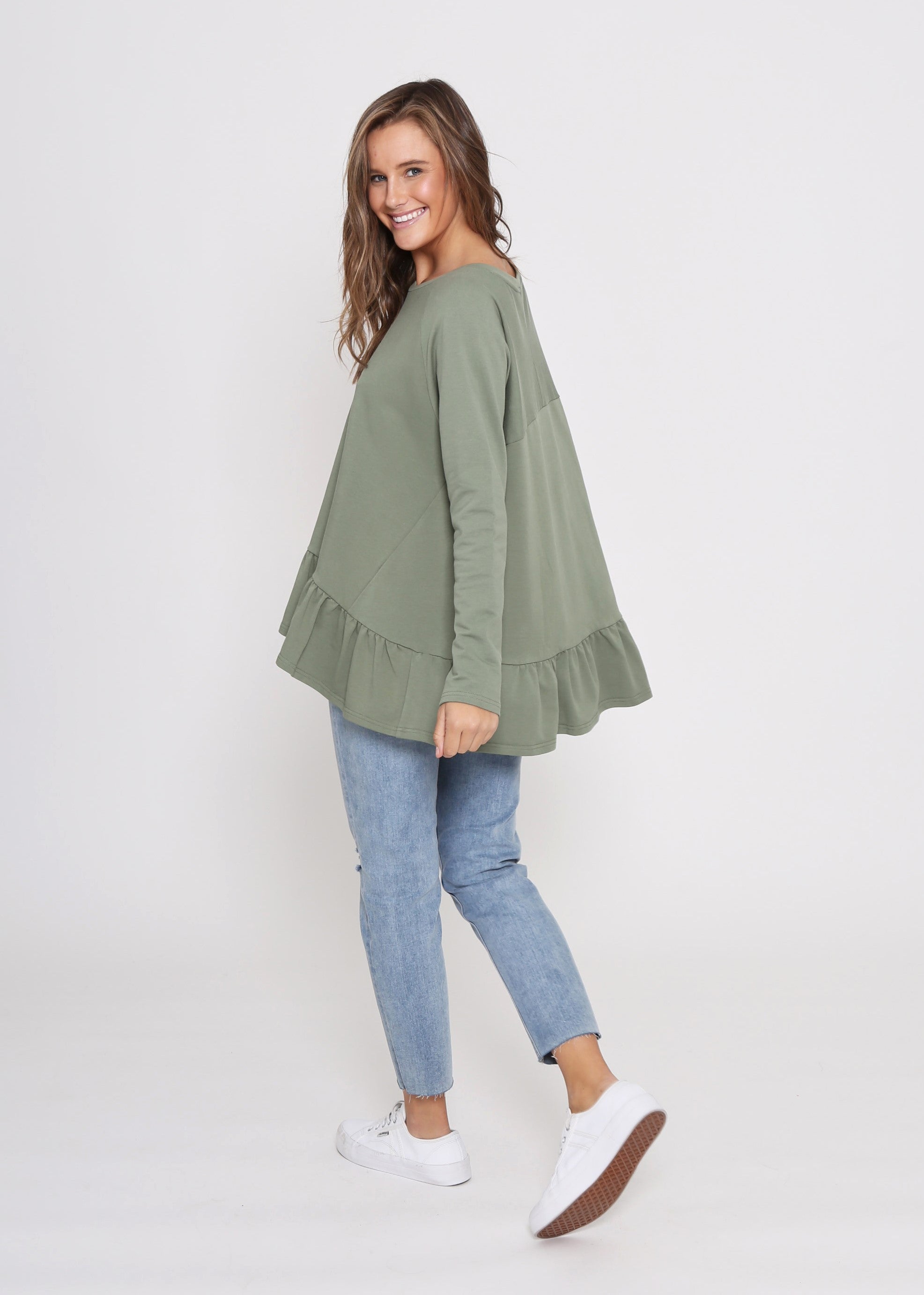 Frill-seekers unite. Here's a luxe sweat that's perfect to throw on when you need to leave the house in a hurry! It's got a loose, flowy fit and flattering high-low hem that covers the bum. We love the thick, warm French terry material. The real star is that gathered frill detail on the hem. It elevates this sweater to "outdoors" material and it's perfect for errands, the school run or a last-minute brunch.