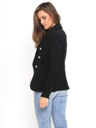 This tailored slim-fit Hayden Blazer features a lapel and double-breasted design. The cropped length adds a clean and sharp look, while the structured shoulders enhance the upper body curves and highlight the waistline. The antique brass/gold buttons add a touch of nobility. This versatile piece can be paired with trousers or skirts, making it suitable for both formal occasions and business commuting. The combination of style and sophistication makes this coat a must-have addition to your wardrobe.