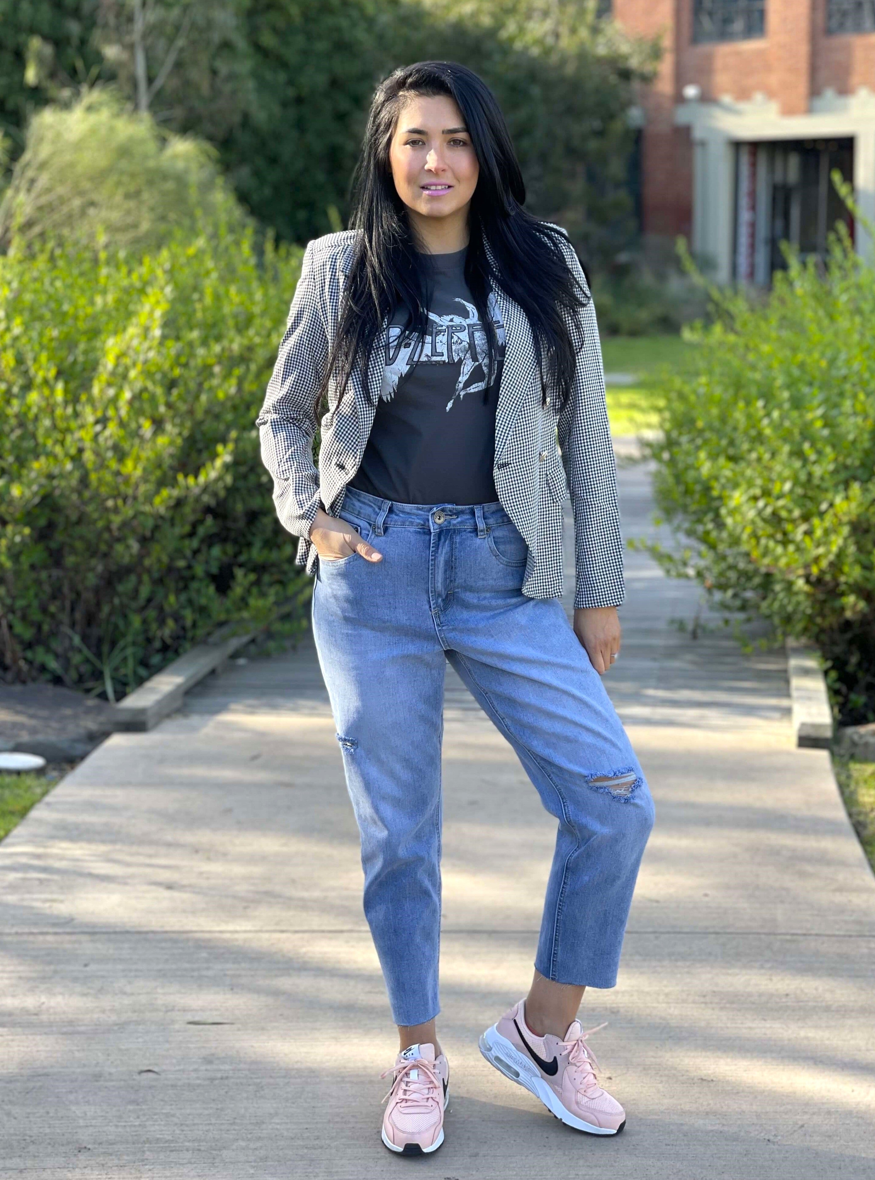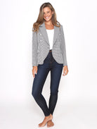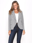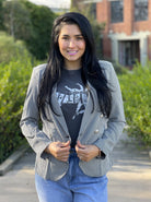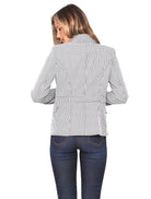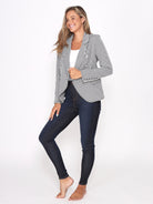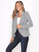 This tailored slim-fit Hayden Blazer features a lapel and double-breasted design. The cropped length adds a clean and sharp look, while the structured shoulders enhance the upper body curves and highlight the waistline. The antique brass/gold buttons add a touch of nobility. This versatile piece can be paired with trousers or skirts, making it suitable for both formal occasions and business commuting. The combination of style and sophistication makes this coat a must-have addition to your wardrobe.
