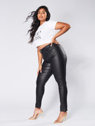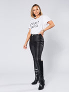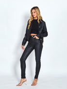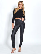 The Selena Skinny Jean Wax Look designed by Monaco Jeans is a gorgeous pair of high-rise jeans that you will surely love. It’s made from cotton, polyester, and elastane, which gives it a bit of stretch. Its beautiful black colour pairs perfectly with a wide range of tops. The Selena Jean Wax Look has a skinny leg design which will accentuate your natural curves. It’s designed with two back and two front pockets. These jeans will take you from weekday through to the weekend with ease. Their wet-look finish will add instant style to any look.