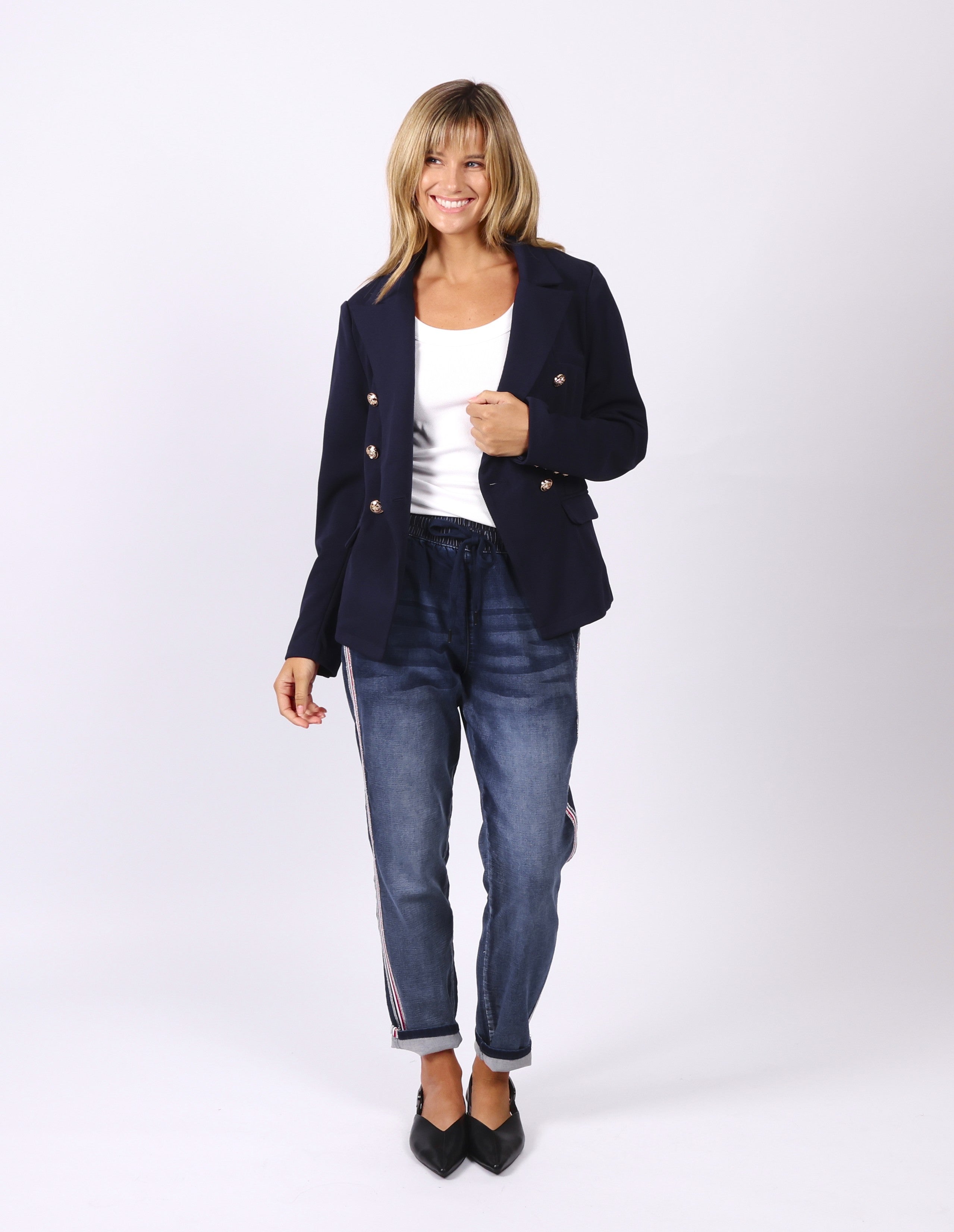 Darcy has paired it up with our Brooklyn Denim Joggers