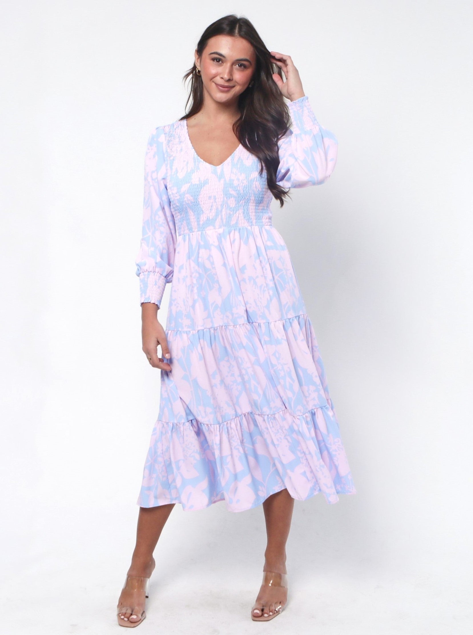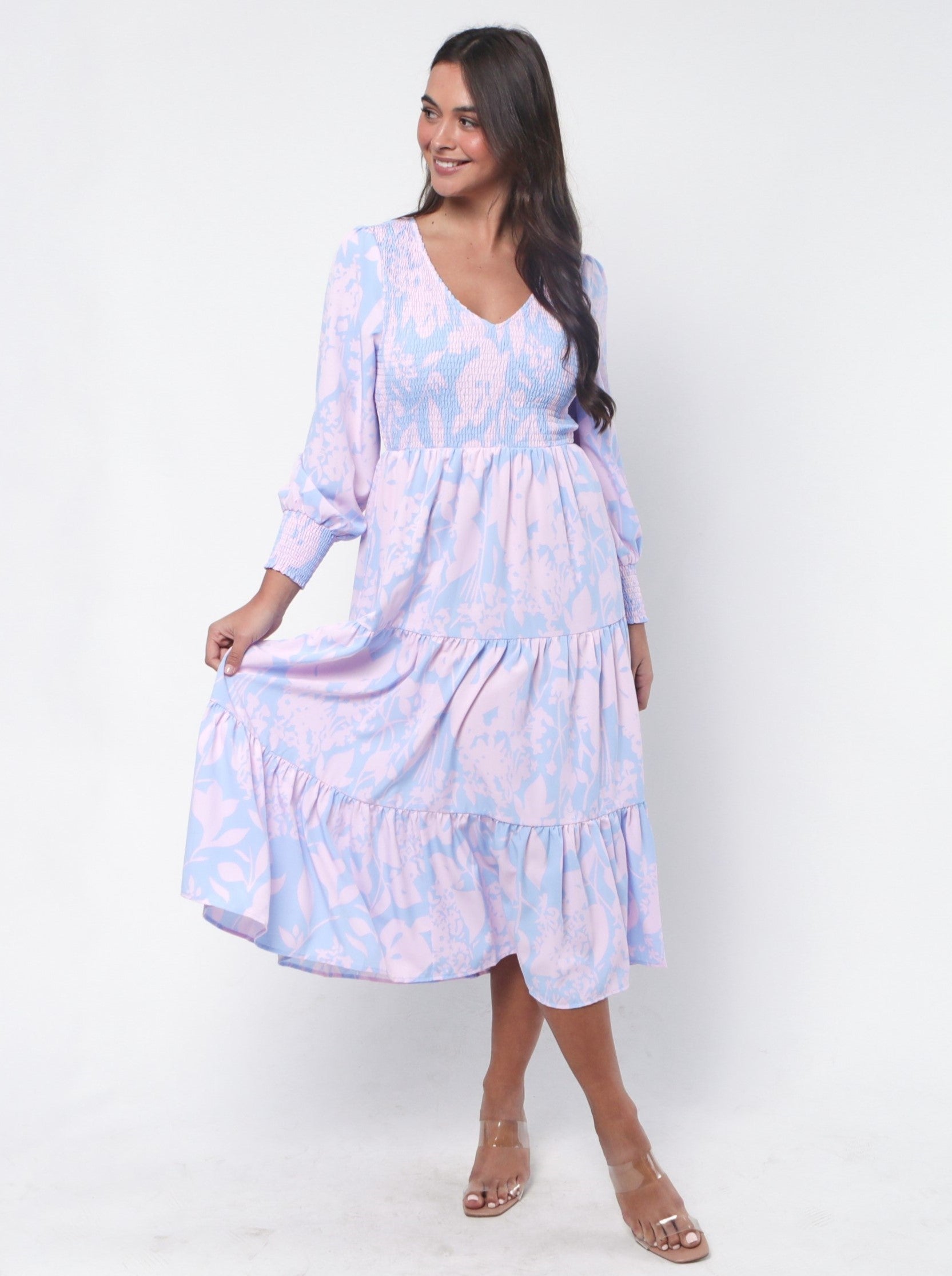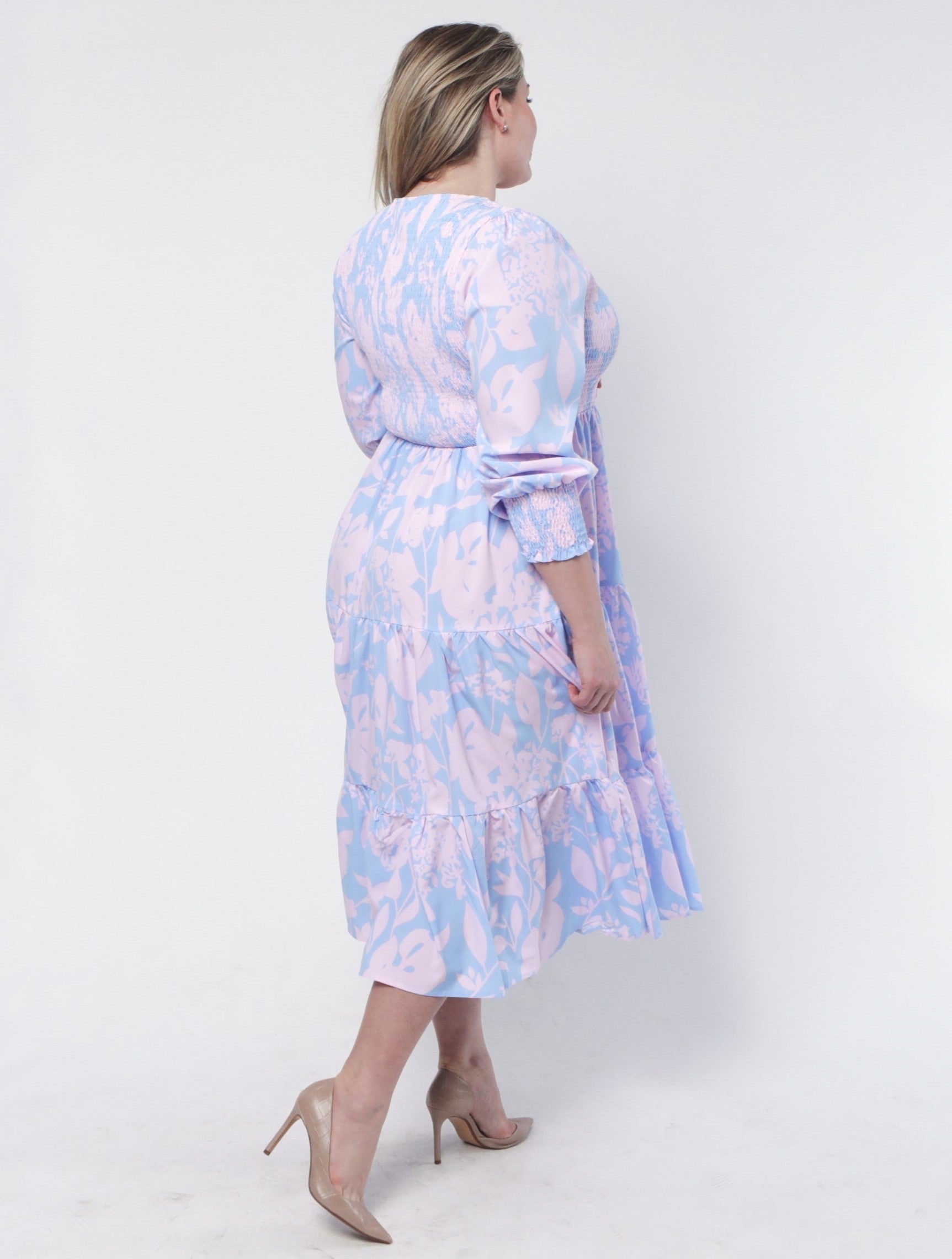 - Shirred bodice and cuffs