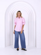 Darcy is wearing Leo Barrel Jeans and Grace Top.