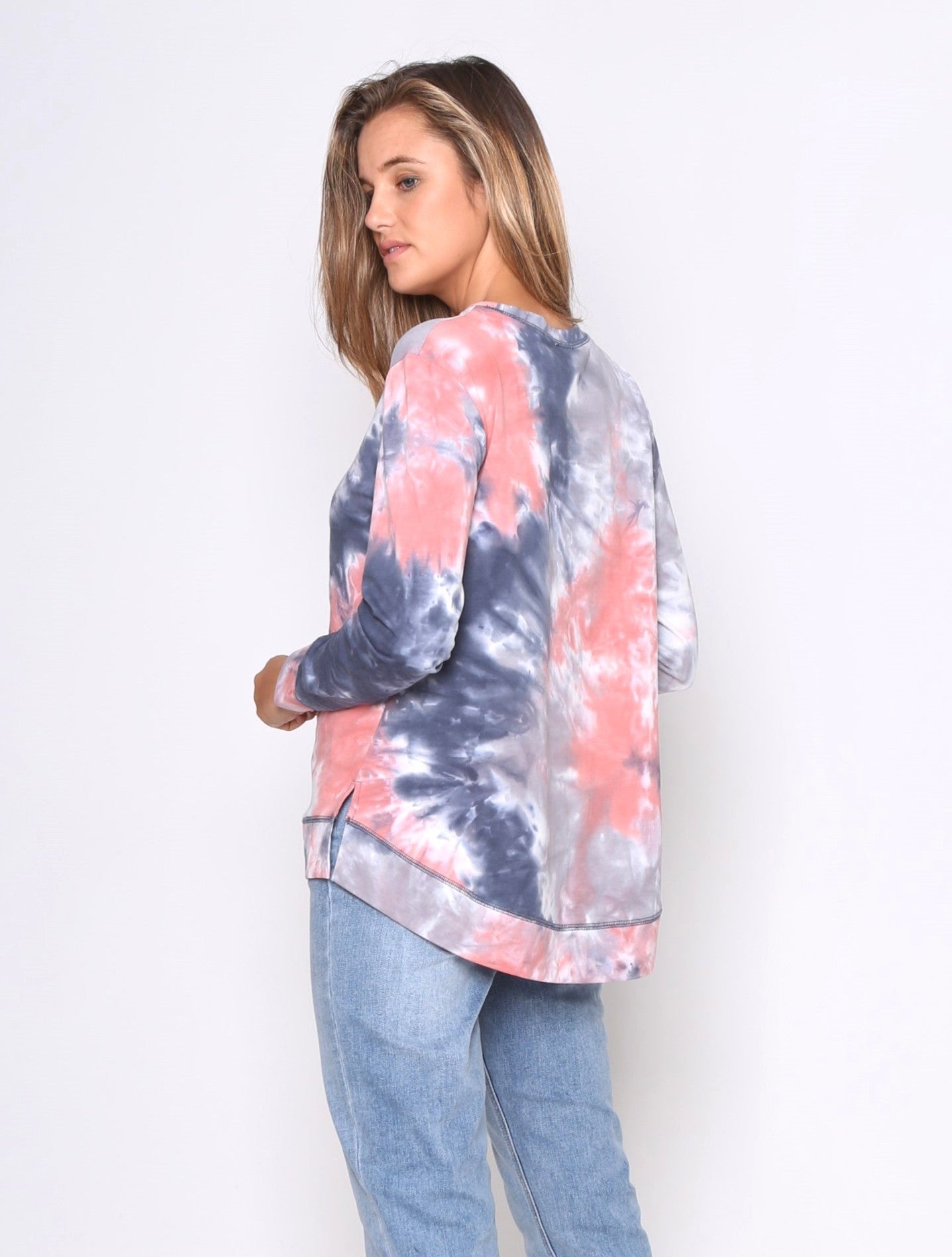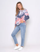 The tie-dye trend is here to stay, and we couldn't be more stoked. We love this bright, fun pop of colour and we know you guys love it too! This sweater has a flattering high-low hem that covers the bum and looks great over your fave denim. There's a side split adding to the relaxed feel of this boxy fitting top, and we've added a ribbed finish on the cuffs and hem.