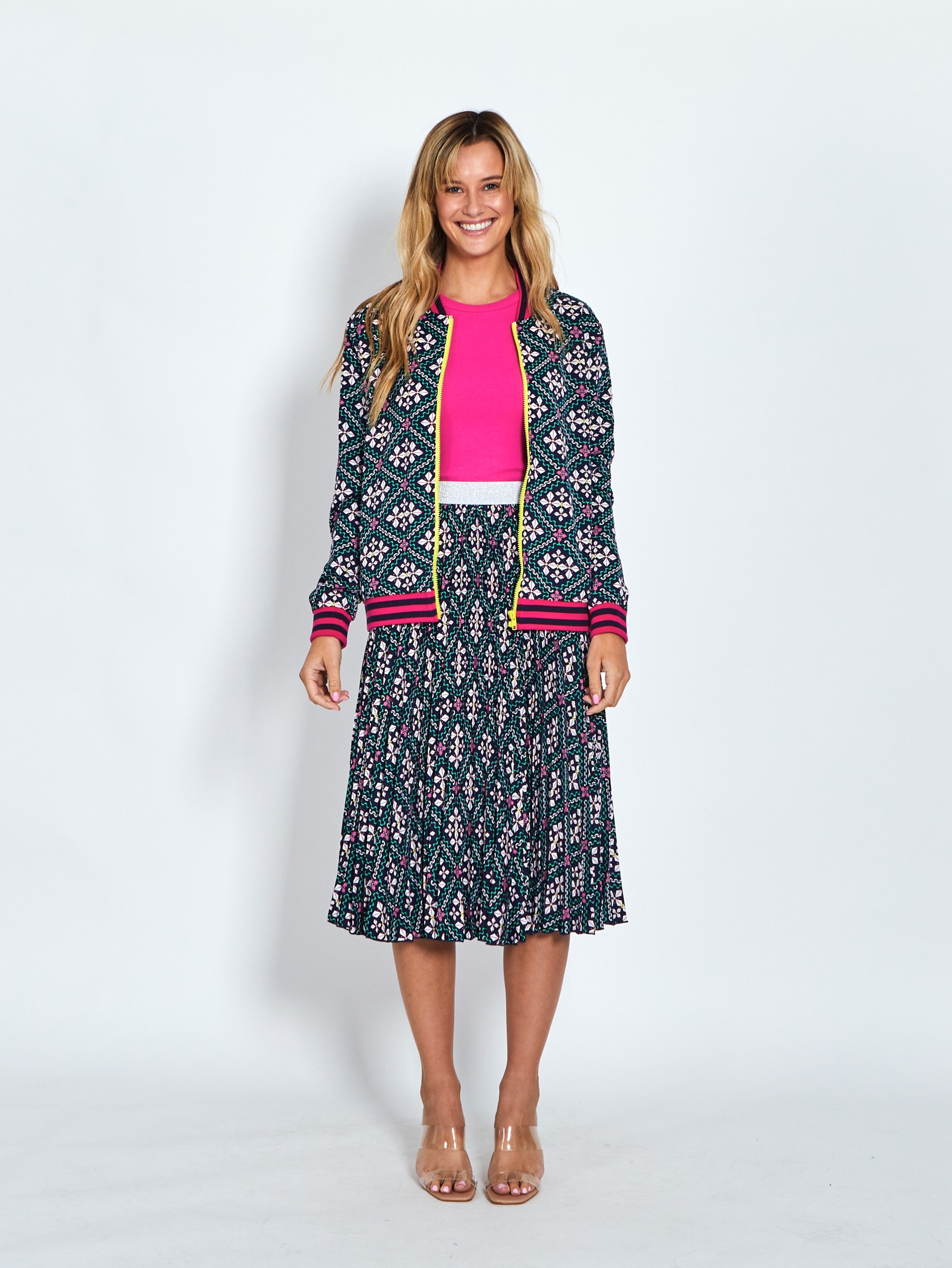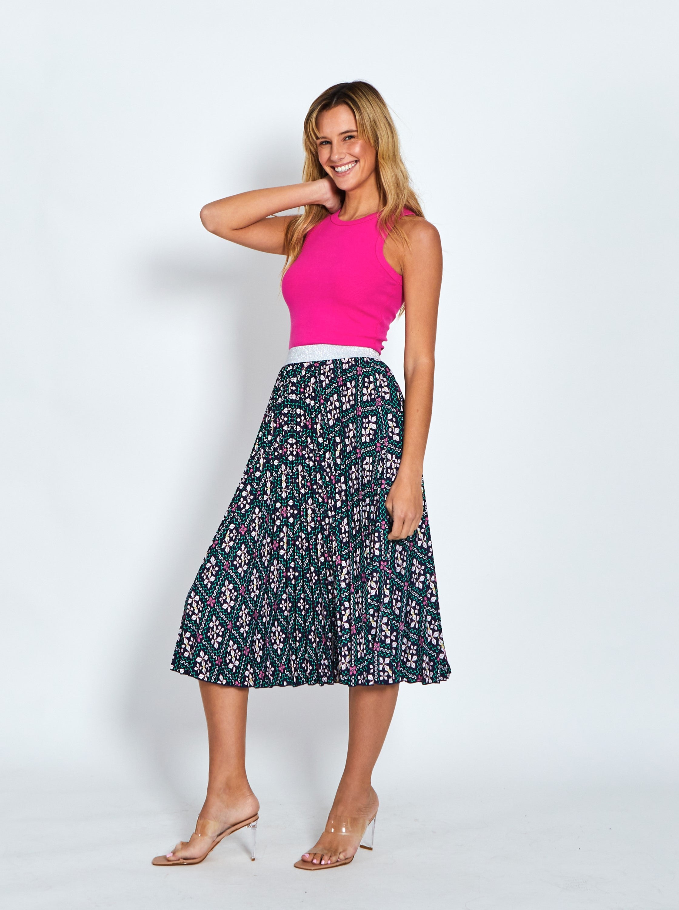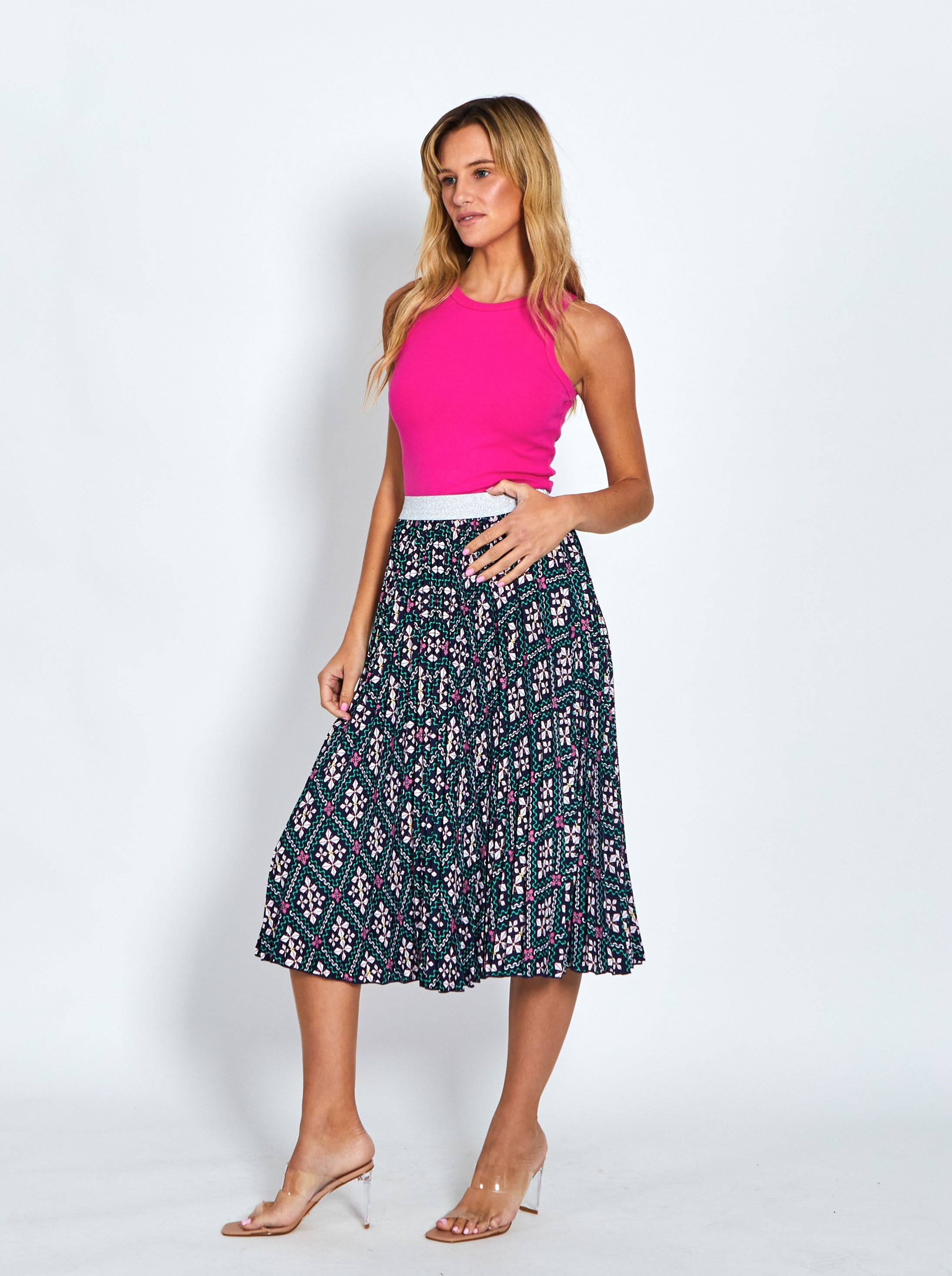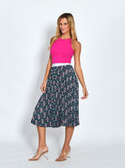 You can't beat the comfort of an elastic waistband Celine Skirt. Made from pleated super soft polyester silky fabric and clad in a vibrant exclusive print, the Celine Skirt is sure to brighten your day. Playful and very pretty, this skirt is midi length and features a silver metallic elastic waistband and a flattering A-line cut. This beautiful feminine Celine appearance that would always have you stealing all eyes!