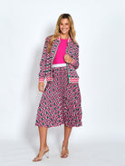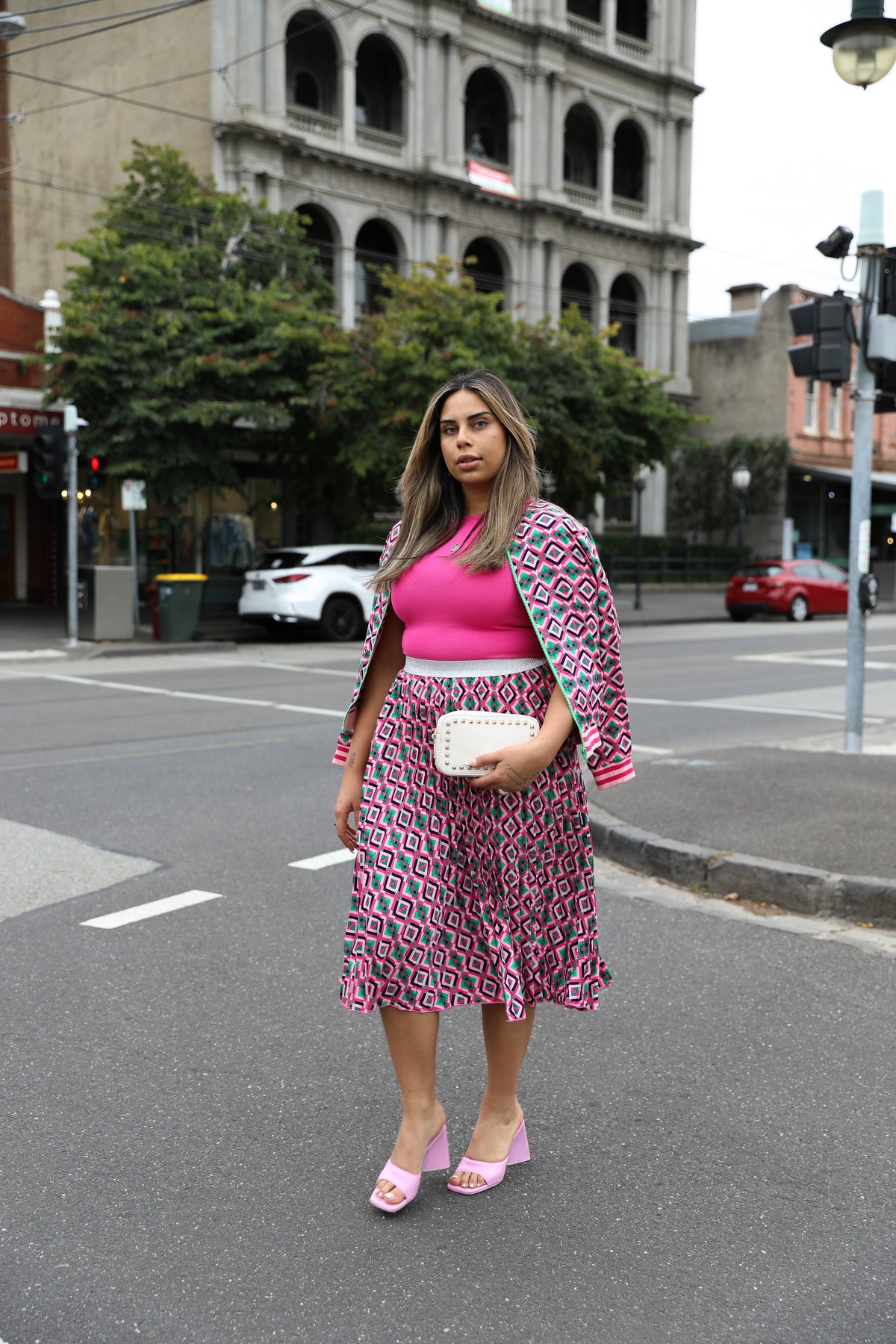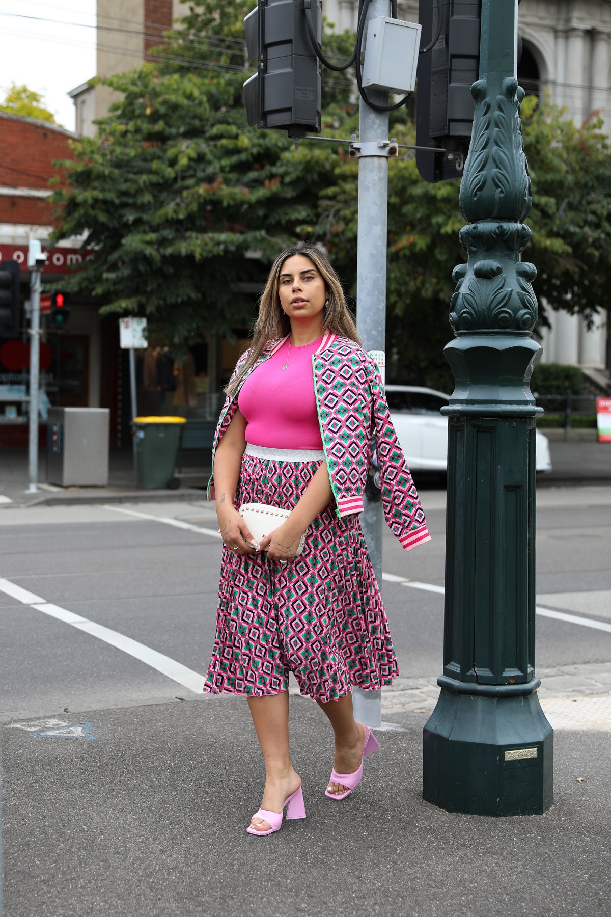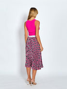 You can't beat the comfort of an elastic waistband Celine Skirt. Made from pleated super soft polyester silky fabric and clad in a vibrant exclusive print, the Celine Skirt is sure to brighten your day. Playful and very pretty, this skirt is midi length and features a silver metallic elastic waistband and a flattering A-line cut. This beautiful feminine Celine appearance that would always have you stealing all eyes!
