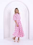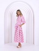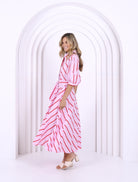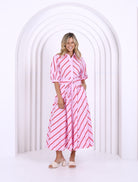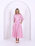 Yarn-dyed stripes enhance the preppy aesthetic of this pure cotton shirtdress, which is designed in an A-line silhouette, relaxed bodice with a flared skirt and finished with our signature elbow-length pleated balloon sleeves. A removable matching belt allows for versatility in styling and waist definition.