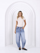 Characteristics of Carson Barrel Leg Jeans include a fitted waist, flared-out shape around the mid-leg, and tapered silhouette at the bottom, which exudes the look of, well, a barrel. It's the vibe of a cowboy ready for a showdown in the Wild, Wild West!!!