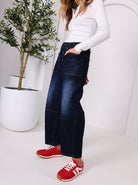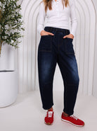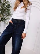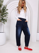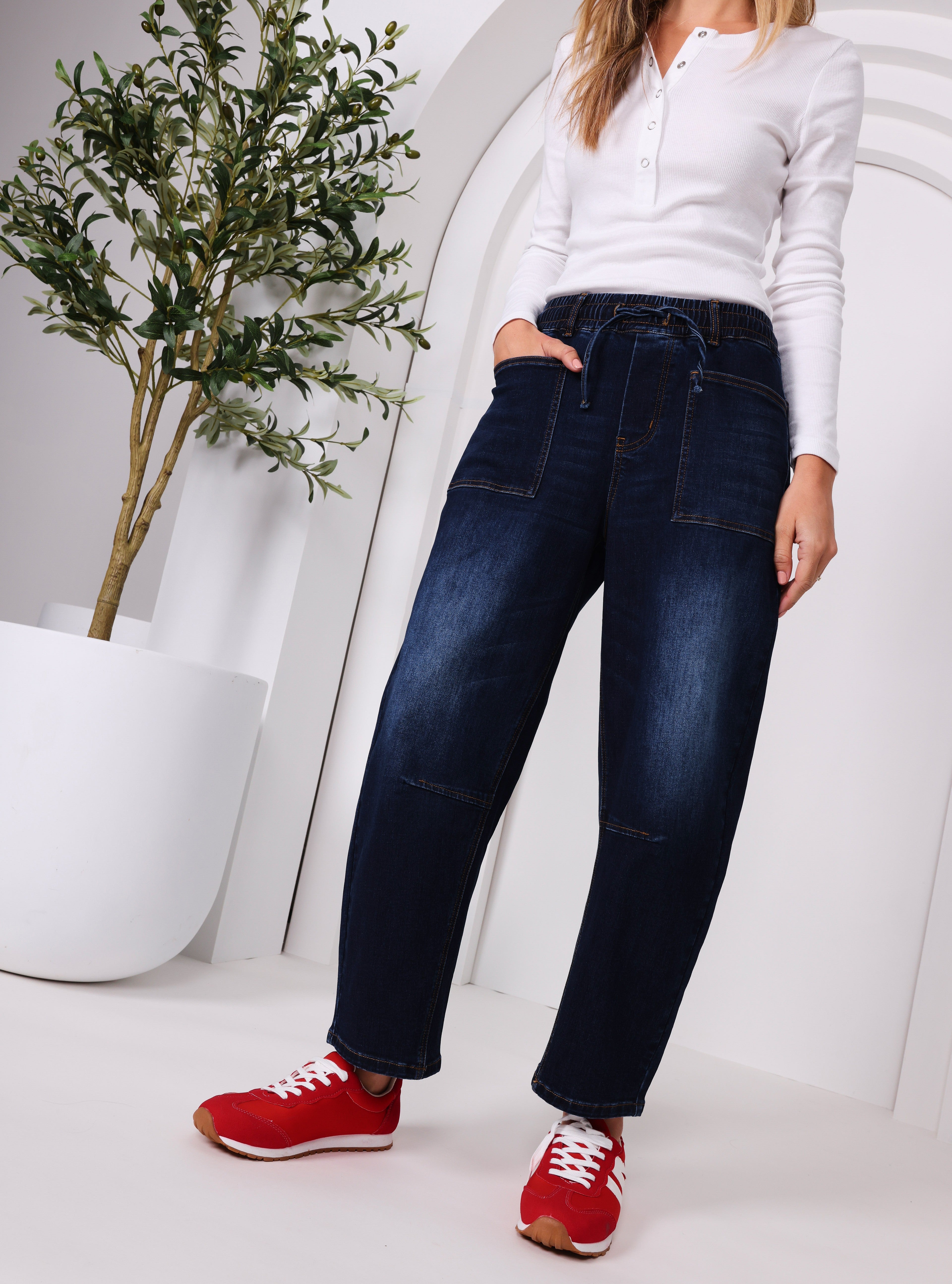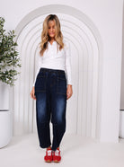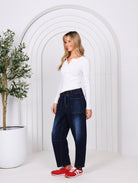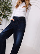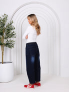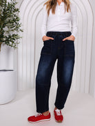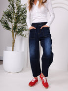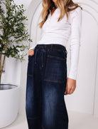 Characteristics of Leo Barrel-Leg Jeans include a fitted waist, flared-out shape around the mid-leg, and tapered silhouette at the bottom, which exudes the look of, well, a barrel. It's the vibe of a cowboy ready for a showdown in the Wild, Wild West!!!
