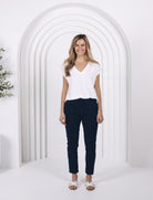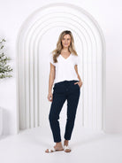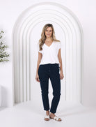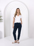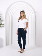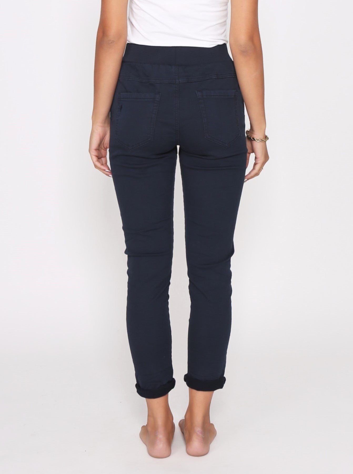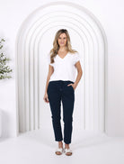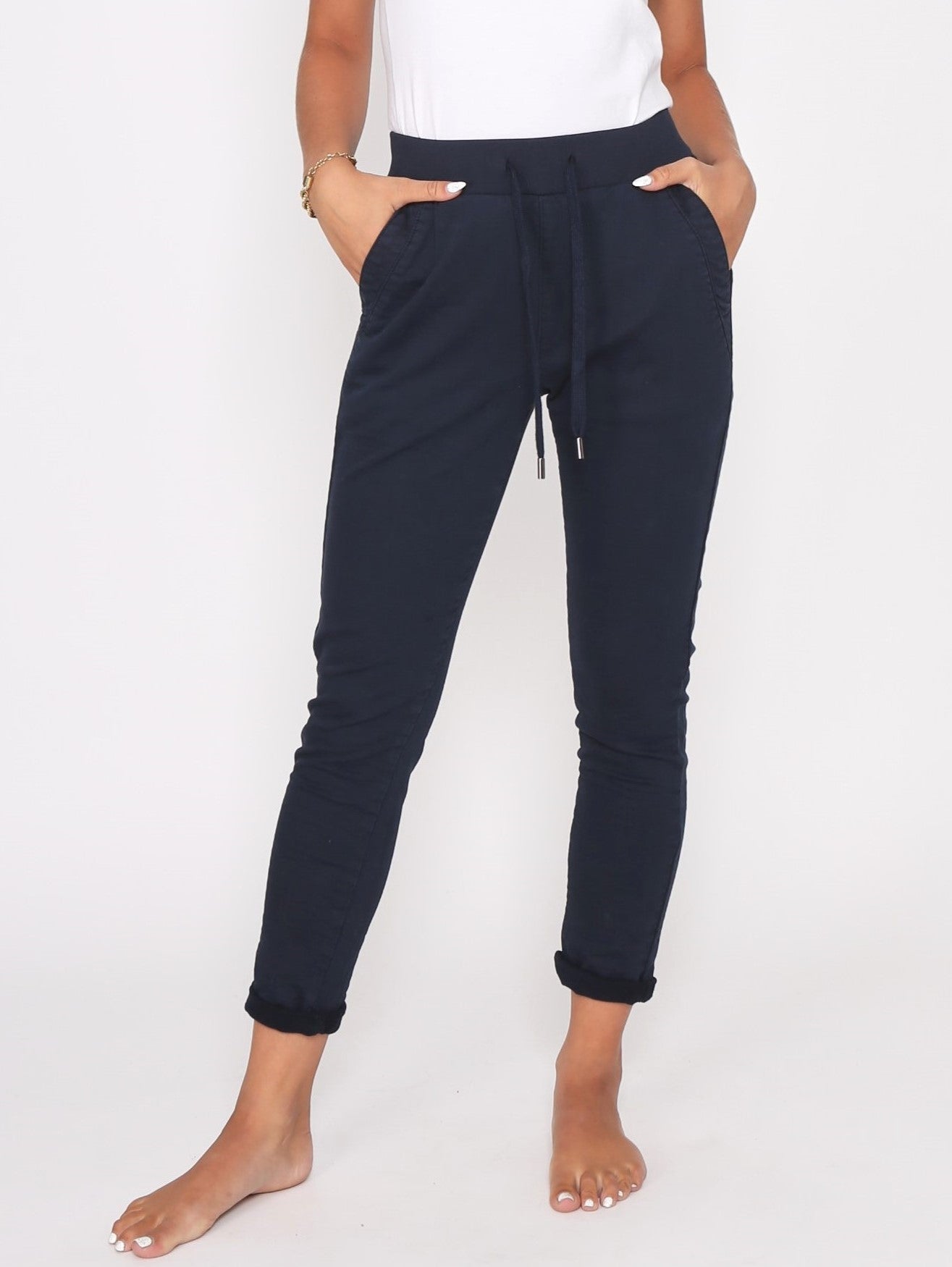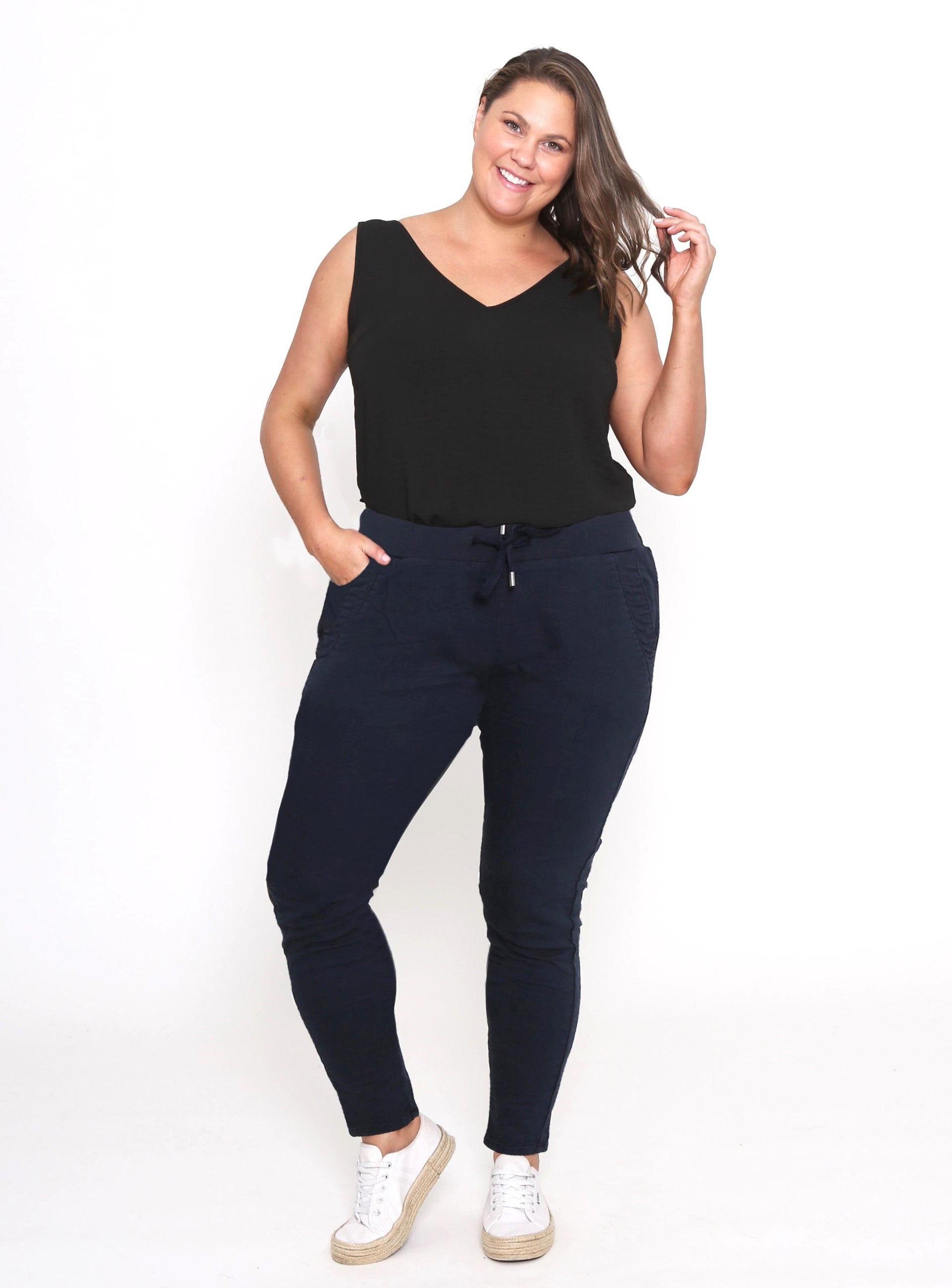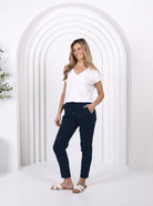 Because some of us just cannot do without denim! The Riley Stretch Denim Joggers designed by Monaco Jeans redefine comfort! The Riley Stretch Denim Joggers is perfect for you want to wear on high rotation are few and far in between! These beautiful joggers are made from super stretchy fabric that is light weight yet excellent quality. Add the Riley Stretch Denim Joggers to your list of wardrobe staples for comfort and effortless style! Featuring an elastic waist with drawstring, slimming relaxed leg that finishes at the ankle and a very on-trend side and back pocket designs.