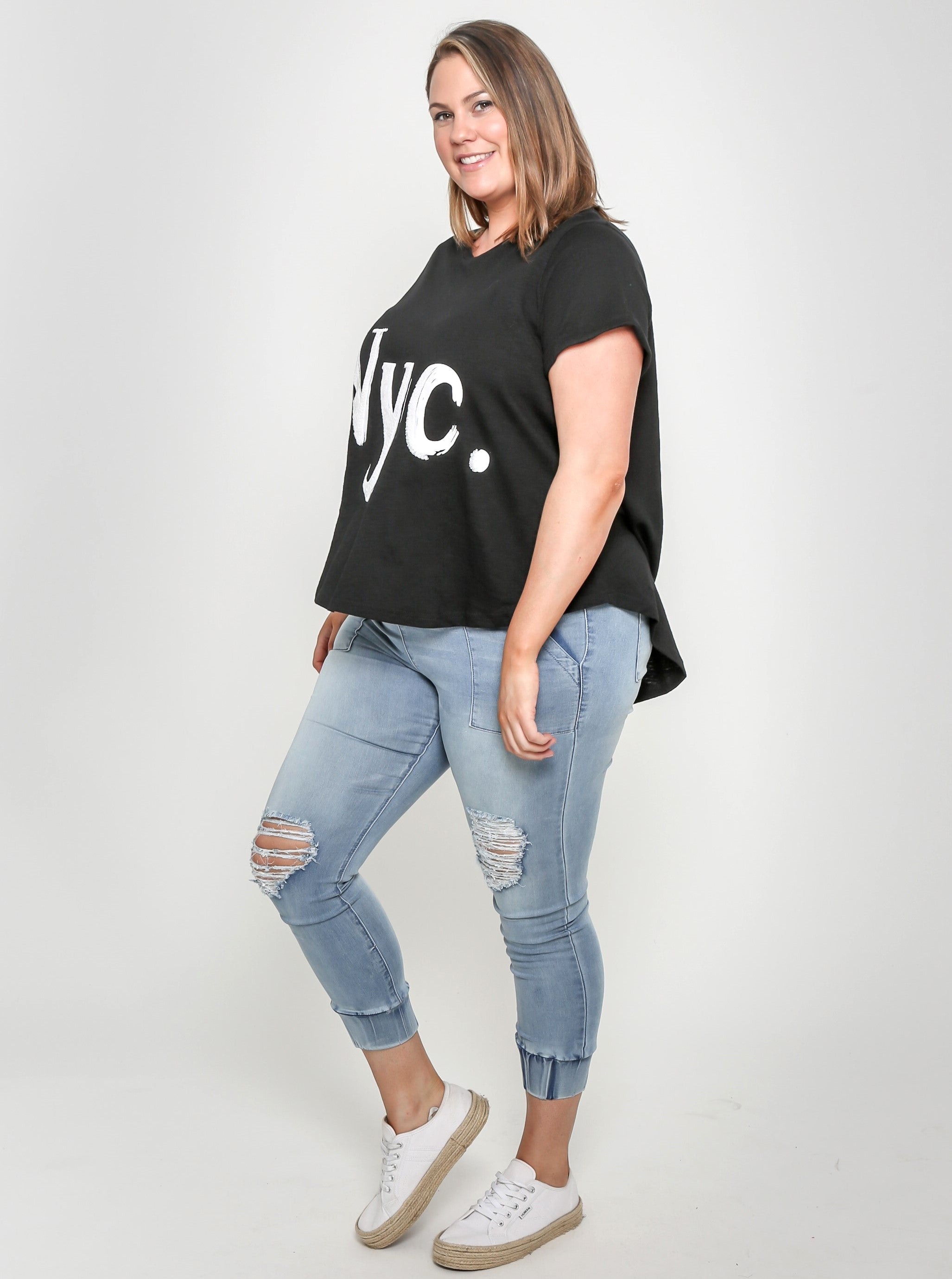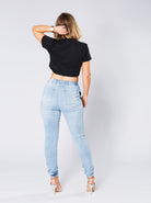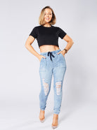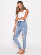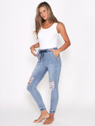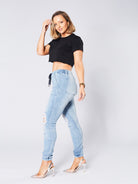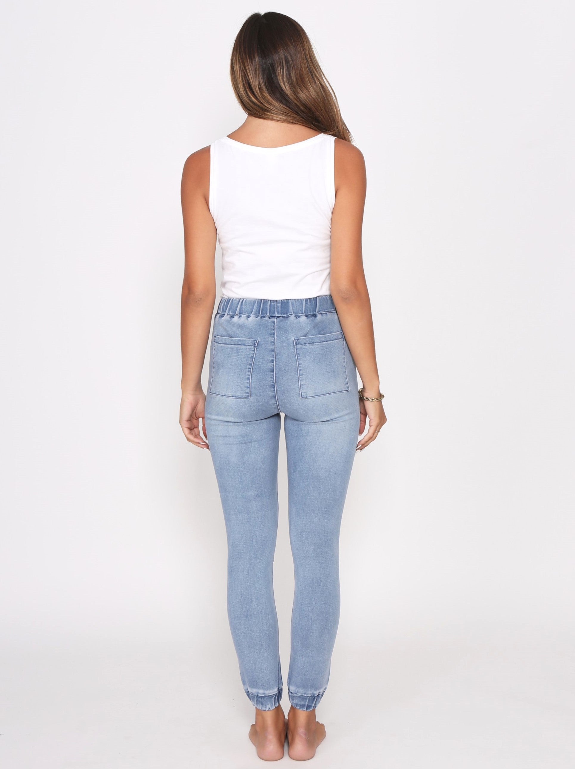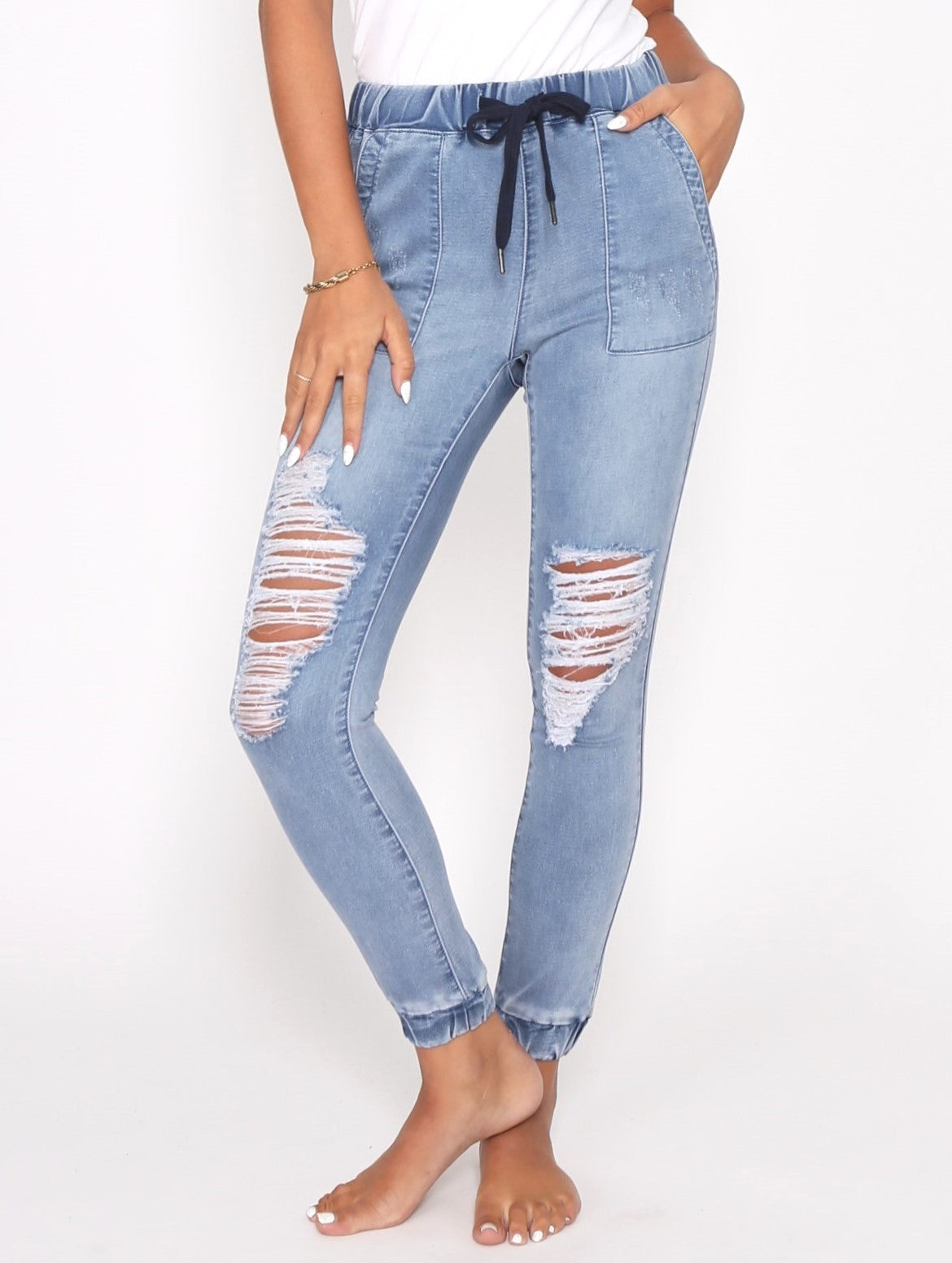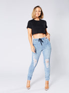 Our Ariana Denim Jogger is perfect addition to your everyday wardrobe. High-waisted style and elastic waistband with drawstring gives that feel of comfort that you have been looking for.